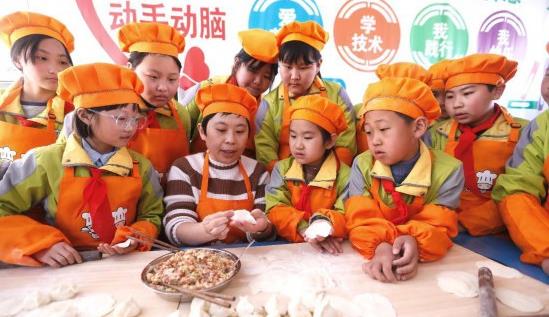3月28日,青岛市即墨蓝谷高新区东皋埠小学的学生在“烹饪课堂”上学习擀饺子皮