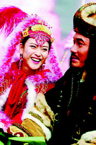 出了雁门关,匈奴大队骑士、毡车、胡姬前来迎迓,抵达王庭之日,但见平沙雁落,黄尘滚滚,牛羊遍地,无边青草。一座座帐蓬中,张灯结彩,欢腾达旦,呼韩邪单于封她为宁胡阏氏(亦即安宁胡地的皇后),百般迁就,以博取她的欢心。然而胡笳悲鸣,骏马奔驰,饮腥食膻,异邦风月,使王昭君总是对故国充满思念之情。所谓: