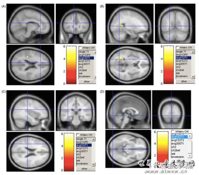 图二 网瘾青少年的大脑灰质密度在(A)左前扣带回皮层、(B)左后扣带回皮层、(C)左侧脑岛和(D)左舌回显著低于对照组青少年