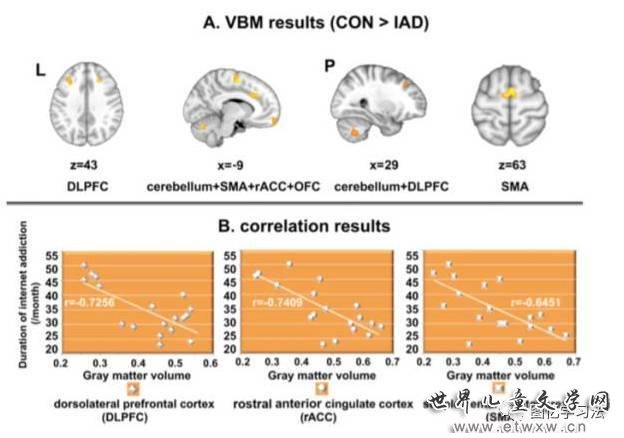 在另外一项研究中,研究人员通过借助基于体素的形态学分析技术(VBM)研究了18名网络成瘾青少年的大脑形态。他们发现,这些青少年在五个大脑区域的灰质体积出现减少,其中包括双侧背外侧前额叶皮层。研究人员还发现,这些青少年大脑灰质的体积大小与他们网络成瘾的时间显著相关(见图三)。