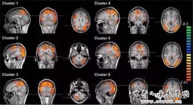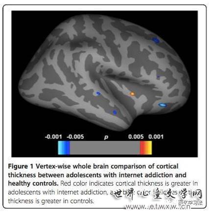 图四 网瘾青少年与健康青少年的大脑皮层厚度对比;红色区域:网瘾青少年的大脑皮层厚度大于健康青少年;蓝色区域:健康青少年的大脑皮层厚度大于网瘾青少年